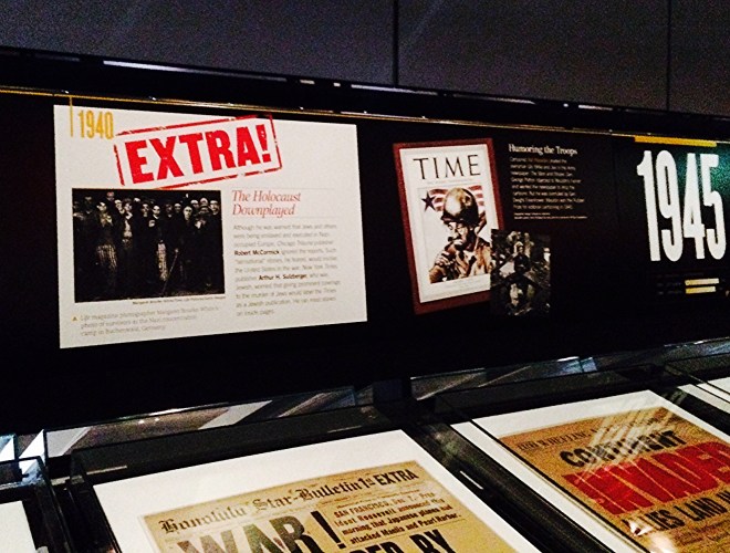 Ma pedig a Newseumot, a hírek múzeumát vettük célba, ahol az egyik első terem a sajtó történetét mondja el. Amikor a második világháborúhoz értem, kerestem a Holokauszt-múzeumban látottak nyomait – önfényezést a sajtó részéről, saját maga ünnepeltetését – de semmi ilyet nem találtam.